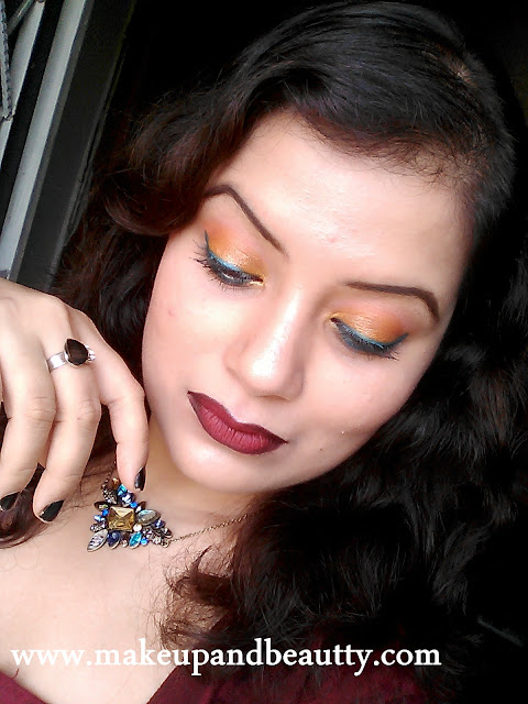 and teal blue combination of eye shadow on my eye lids. Weird combination and yes scary a bit too. I found being Indian it is definitely tough to work this look on our skin tone as we mostly have warm undertone and that's why to make it little wearable i keep my eyes simple, focusing on my lips only. Definitely it is a night out look and dramatic too but if you are confident then you definitely can try it for night out party ;)