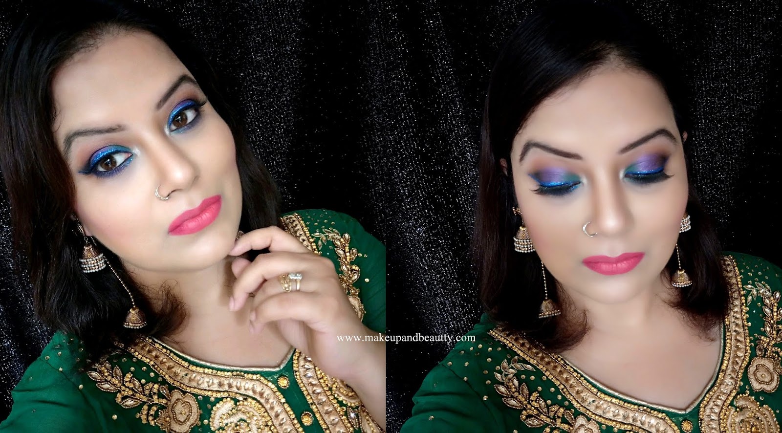 I paired up the blue-purple green eye look with coral red ombre lips this Eid.